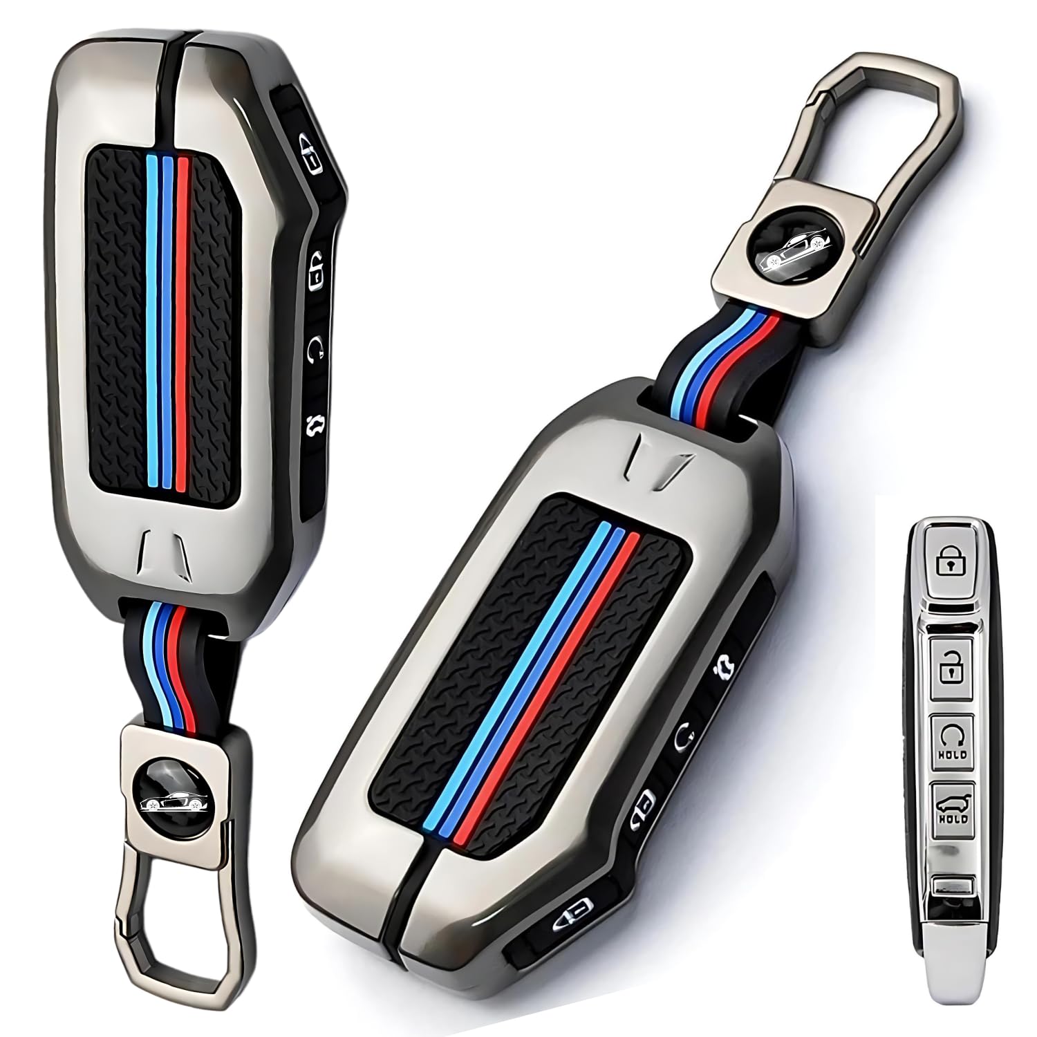 Metal Shell Silicone Key Cover Compatible with Kia Seltos 2023 2024 Facelift HTX | Carens X Line | Sonet Facelift | 4 Button Remote Key Cover for Kia